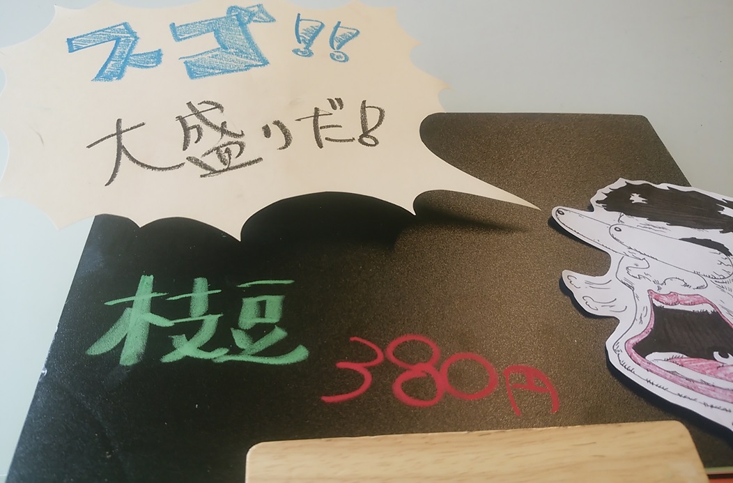 下の写真は「ふきダシ」の項目で紹介したものと同じです。ここにはすでに「はみダシ」のしかけが盛り込まれています。ポイントは、左上にある「すごーい!」というふきだしの取り付け方です。土台である黒板の枠から「はみダシ」て取り付けてあります。これです。とてもシンプルですが、このようにはみ出して取り付けることがポイントです。人ははみ出したものに目線を向けやすいのです。枠の中に納まったものよりも、ボコッとはみ出ている方が違和感があるので目が向きやすいのです。 「出る杭は打たれる」と言いますが、周りと比べて出っ張っているからこそ目立つのですね。目線を集めたいPOPであれば、はみダシは有効な手となります。